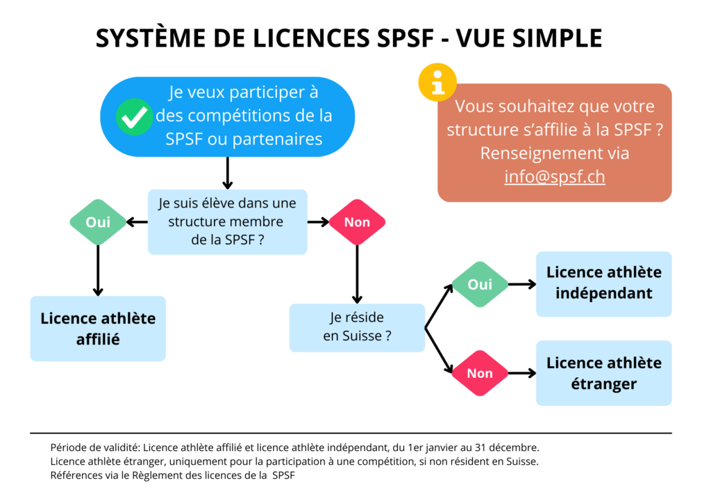 La licence d’athlètes est le passeport obligatoire pour participer à des événements officiels et aux compétitions en suisse. Elle vous identifie en tant qu’athlète et garantit que vous évoluez dans un cadre en développement, sécurisé, respectant l’éthique et reconnu par la SPSF.